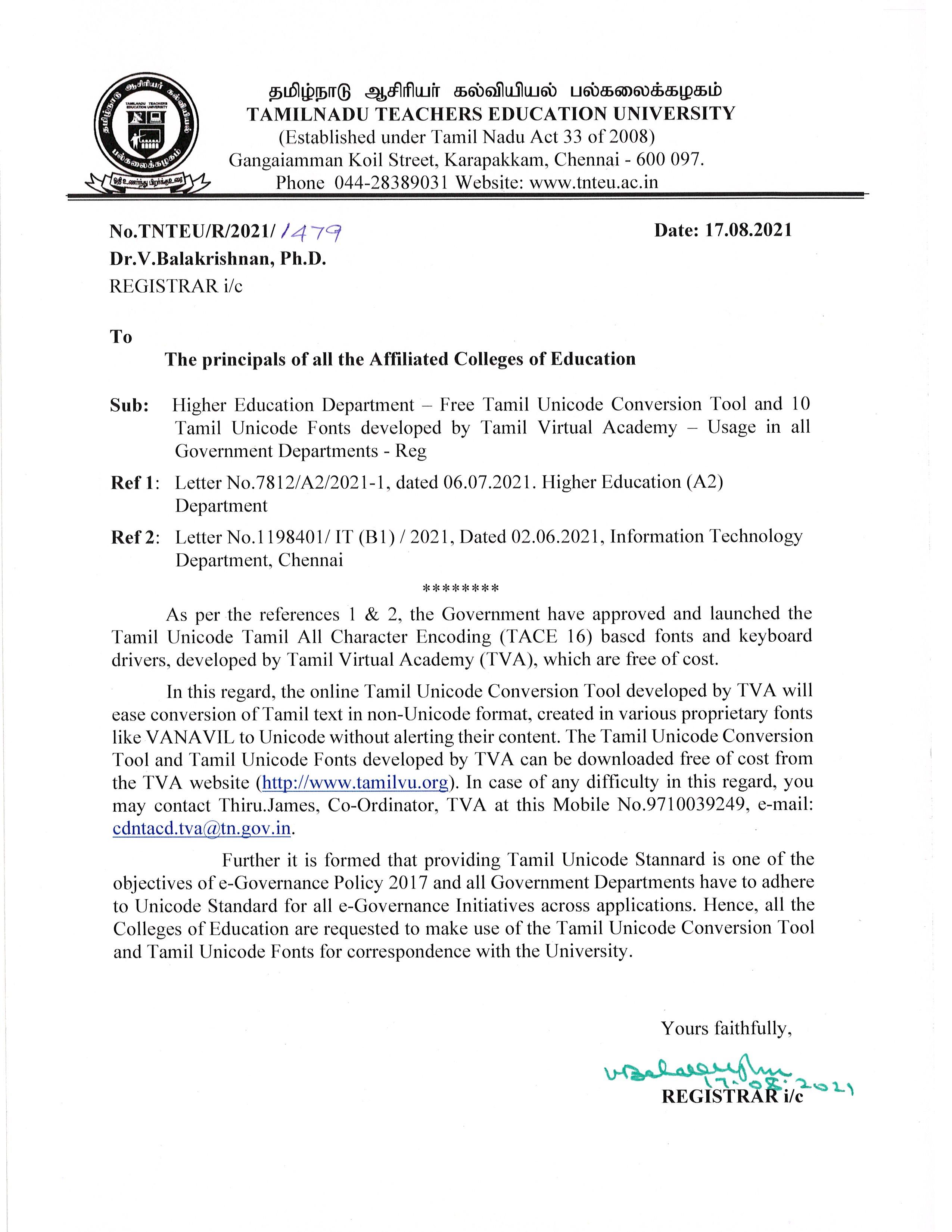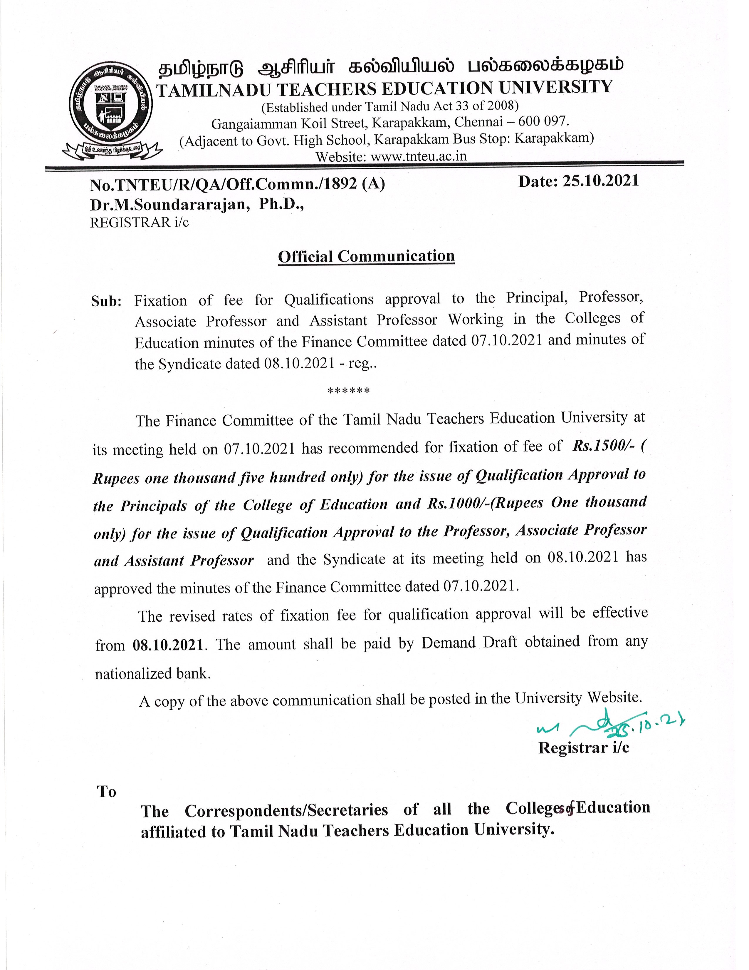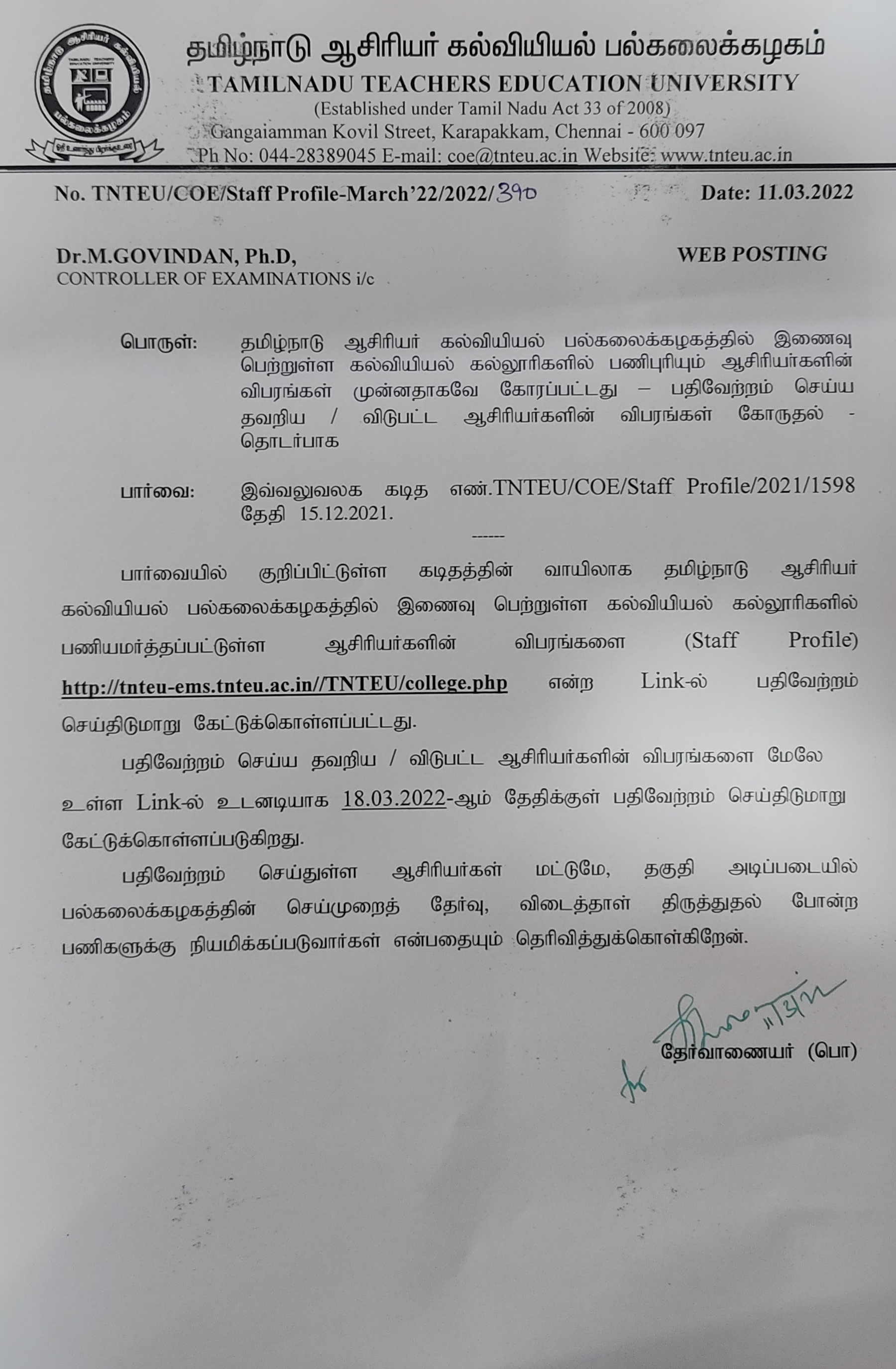 TNTEU-All Affiliated Colleges-Intimation-Reg