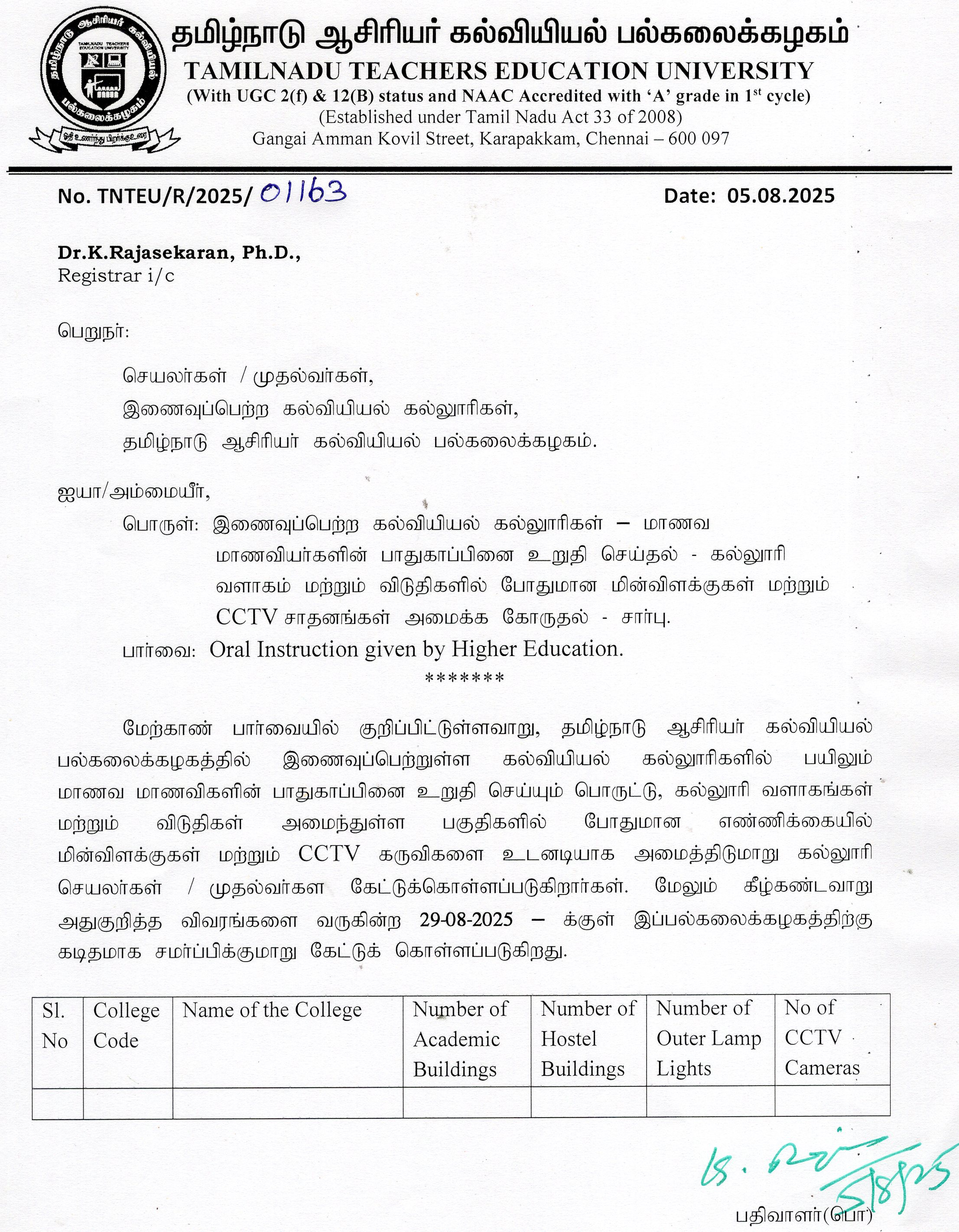 TNTEU - CCTV Fixation-Intimation to all Affiliated Colleges-Reg